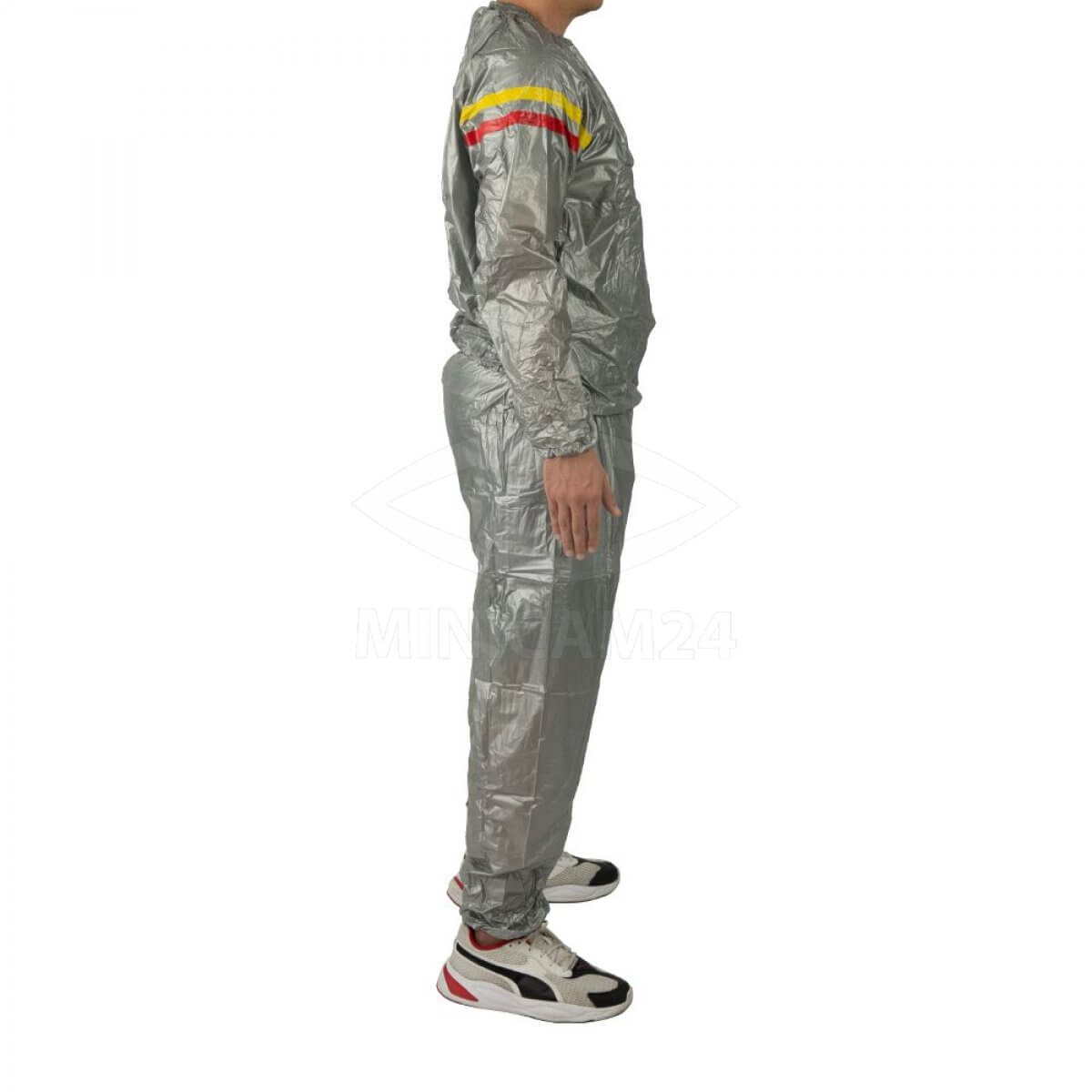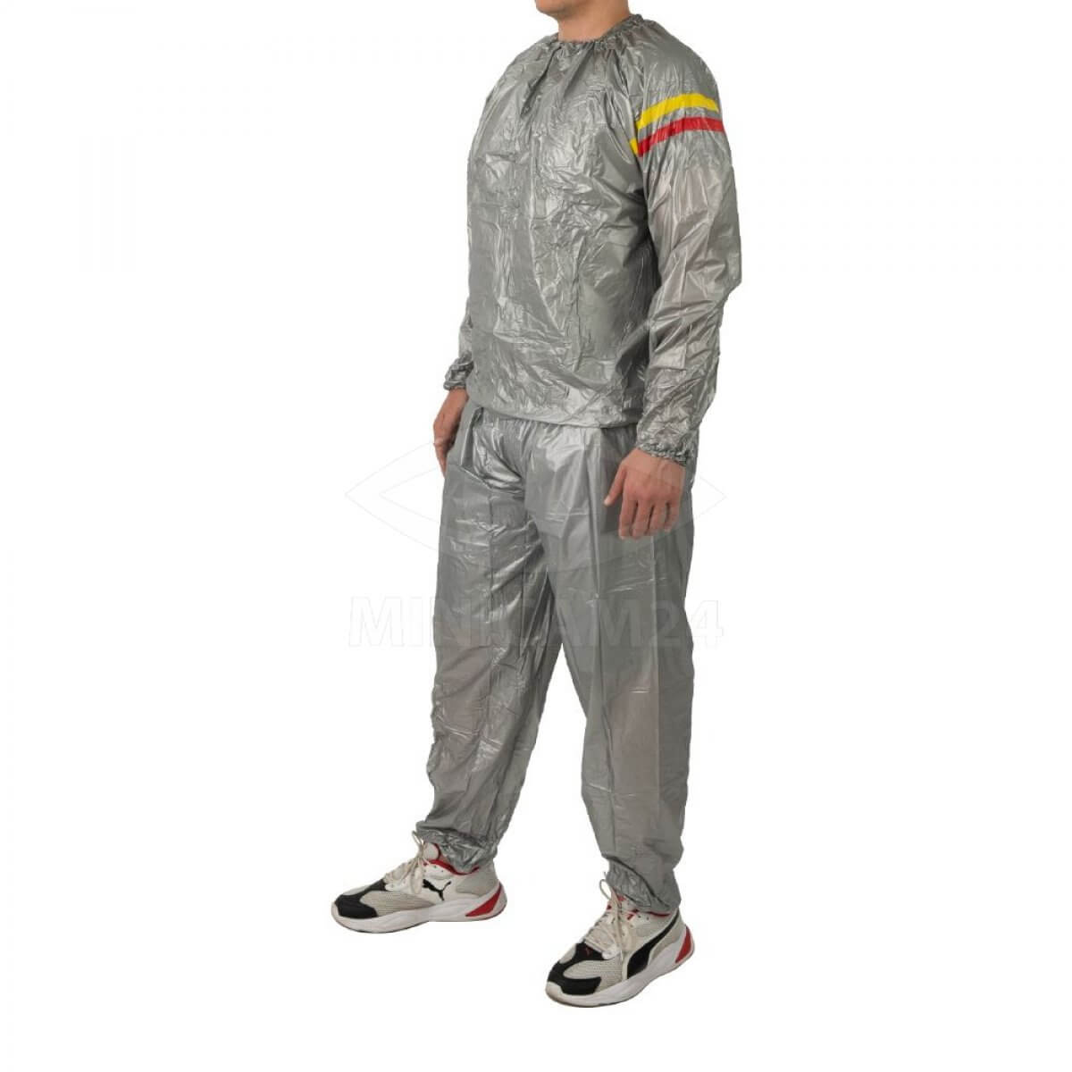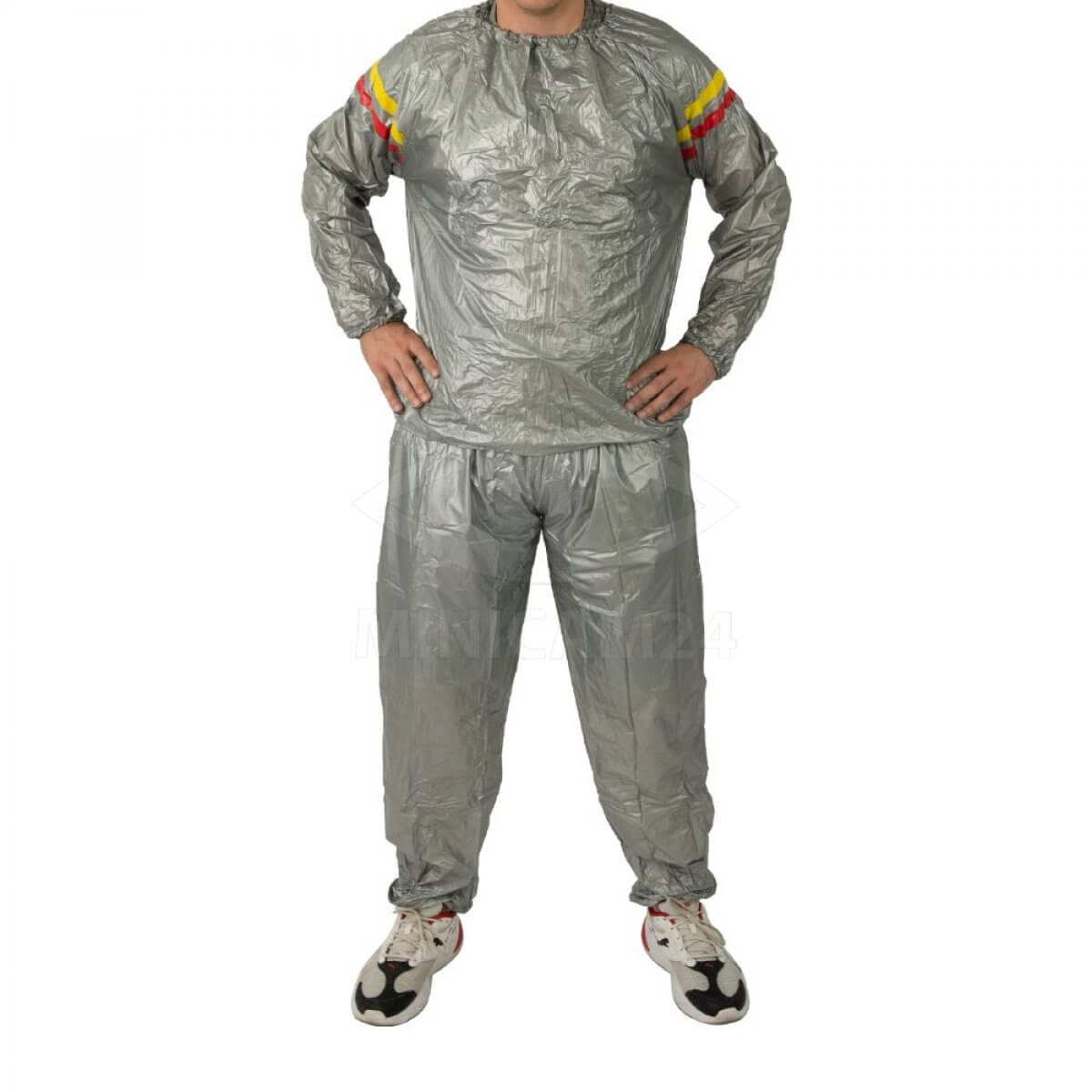 Предлагаемый костюм выполнен из 100% винила или поливинилхлорида – нетоксичного синтетического материала с гипоаллергенными свойствами. Его уникальные свойства позволяют хорошо удерживать естественное тепло, исходящее от тела, благодаря чему человек потеет. Из-за этого происходит расщепление жиров, благодаря чему проявляется эффект похудения. По внешнему виду одежда напоминает костюм из болоньевой ткани, а дизайн выполнен в спортивном стиле. С его помощью вы сможете похудеть, устранить отеки, предотвратить целлюлит или избавиться от него, а также очистить организм от шлаков. И при этом вы будете выглядеть стильно в костюме универсального цвета.